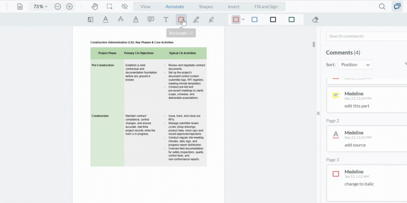 - Precision: Use the Arrow or Rectangle tools for specific UI/layout feedback to ensure the task is clearly linked to the correct PDF element.
